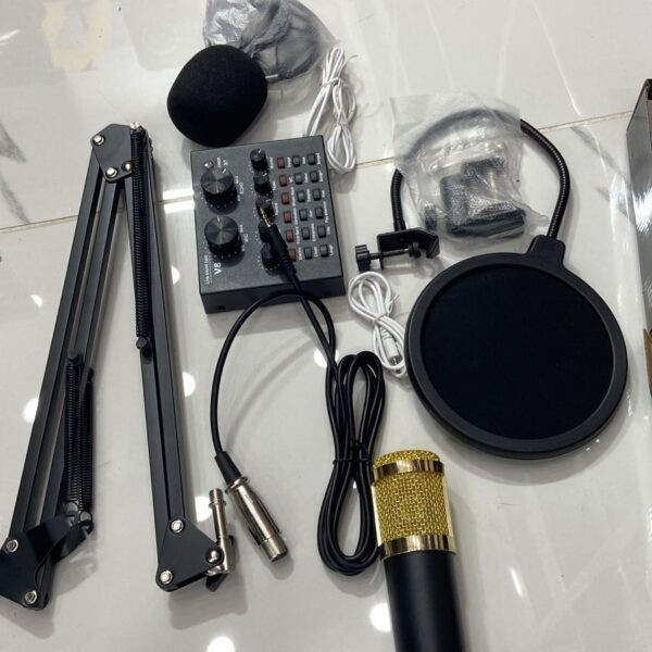 • طقم احترافي متكامل للبودكاست (ميكروفون , كارت صوت خارجي, كابلات التوصيل, حامل للمايكروفون)